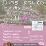 2026年1月7日 / 最終更新日時 : 2026年1月7日 admin 大東市 【開催案内】いのちについての話をしよう ― ACP・緩和ケア・人生の最終章を考えるフォーラム 大東市の皆さま、こんにちは。 この度、大東市提案公募委託事業として、大切な「いのち」と向き合い、これからの生き方を共に考えるフォーラムを開催いたします。 人生の最終章をどう過ごしたいか。 自分や大切な家族のために、今から […]