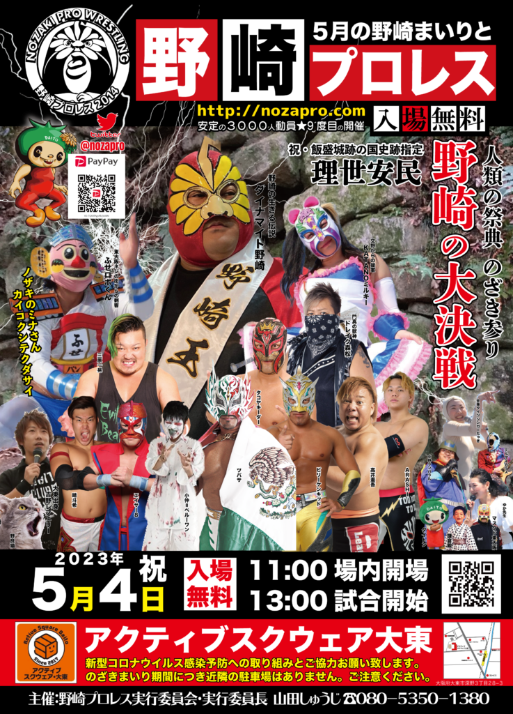 野崎まいり期間中、毎年5月4日に行われる野崎プロレスが近づいてまいりました。今年で第9回目となる野崎プロレスですが、毎年3,000人が来場、音楽あり、飲食ありで楽しいイベントです。今年は出店ブースがさらに充実です。大東市からはもちろん「ダイナマイト野崎」が出場します。応援よろしくお願いします。