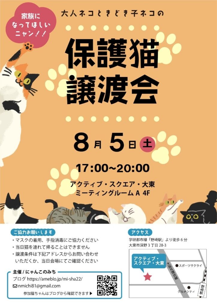 住道、野崎を中心に活動されている「にゃんこのみち」さんの第42回保護猫の譲渡会です。8月は夜間の土曜日の開催になります。参加猫情報は「にゃんこのみち」さんのブログで紹介されますのでご覧ください。