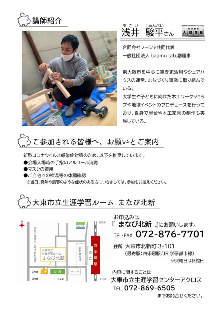 まなび北新にて 来館・電話・FAXで受付 大東市立生涯学習ルームまなび北新 ※火曜日は休館日 【住所】大東市北新町3-101 【TEL・FAX】 072-876-7701