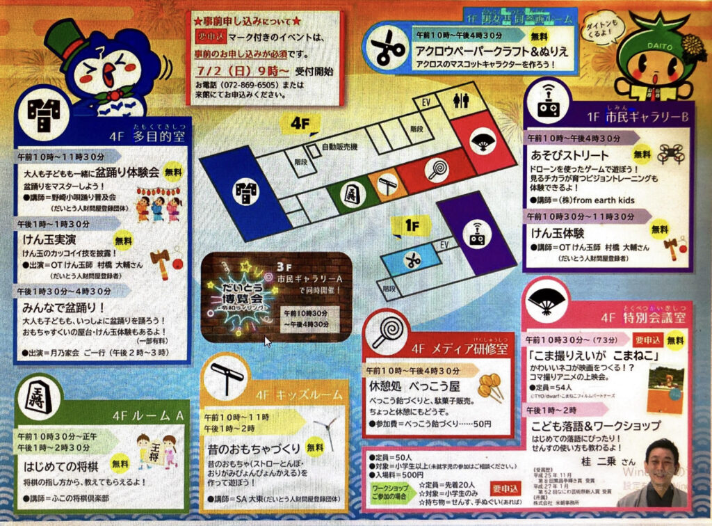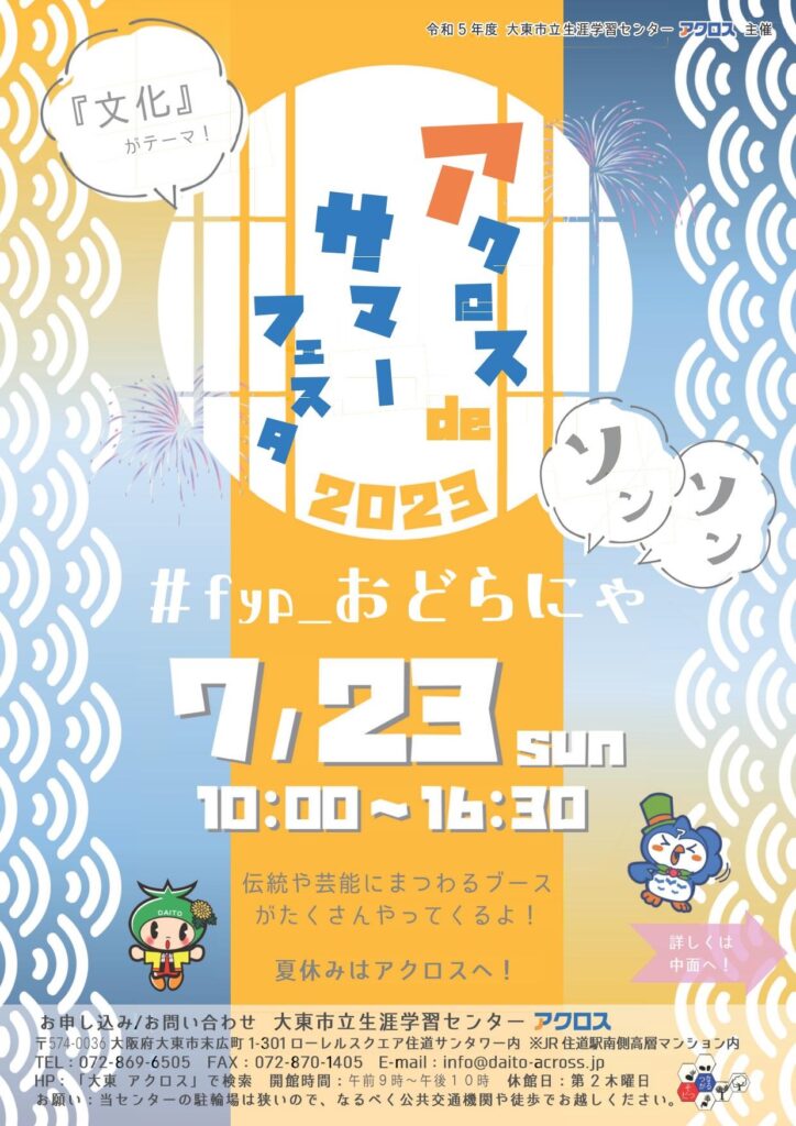 7月23日(日)生涯学習センターアクロスにて「アクロスサマーフェスタ2023」が開催されます。今年のテーマは『文化』。伝統や芸能にまつわるブースがたくさんあります。夏休みにぜひご家族でおでかけ下さい。市民ギャラリーAで「だいとう博覧会」同時開催です。