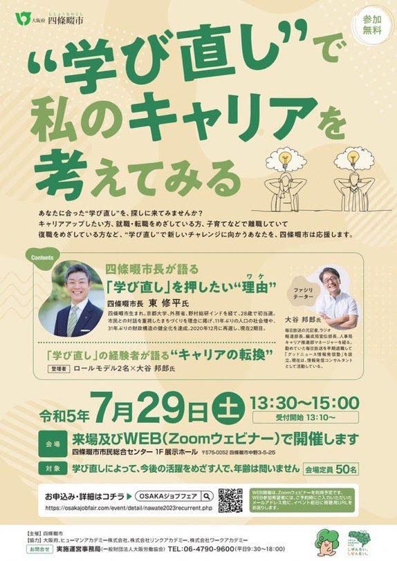 四條畷市の東市長と大谷氏の対談形式により、四條畷市が今、市民の大人の学び直しを後押しする背景などをお伝えします。